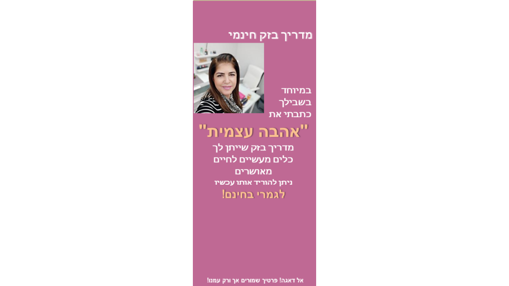 במיוחד בשבילך כתבתי את המדריך לאהבה עצמית, אני מאמינה שכאשר אנו מרגישות טוב עם עצמנו, ולאחר שטיפלנו בפנים עכשיו הזמן לטפל בפנימיות ואז פניך יזהרו כי הכל קשור גוף נפש אחד הם….